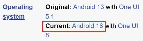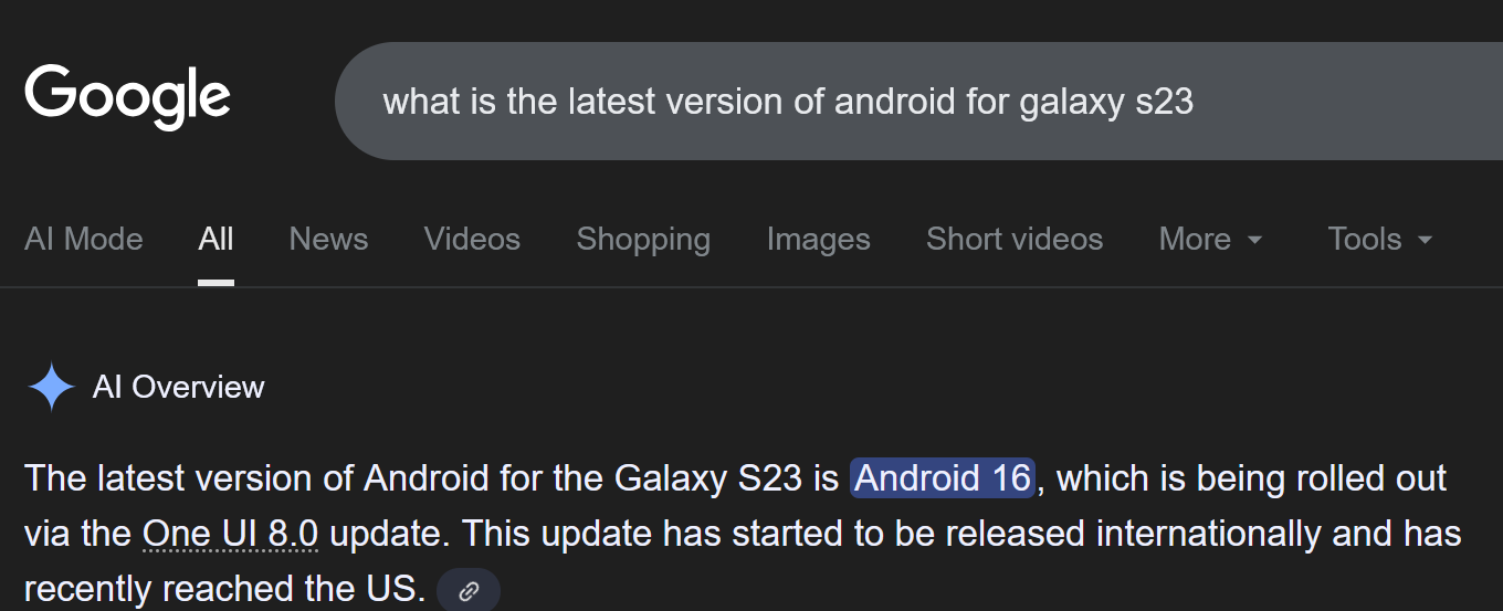 Google, search for: what is the latest version of android for galaxy s23. Results show Android 16