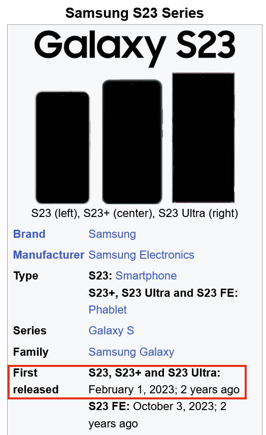Google, search for: when was galaxy s23 released. Results show it was release in 2023