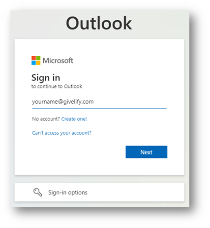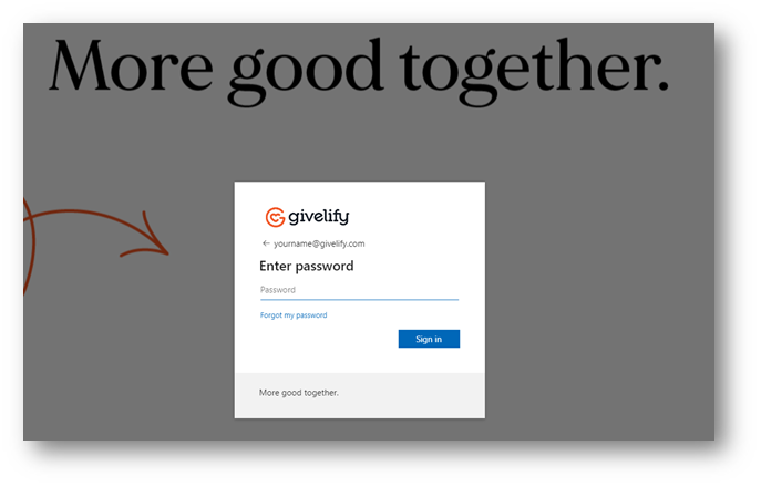 Before you enter your password, make sure you see the Givelify logo and More good together in the background. Also ensure that the URL of the page you are currently on ends with microsoftonline.com. This is to avoid entering your password on a phishing site.